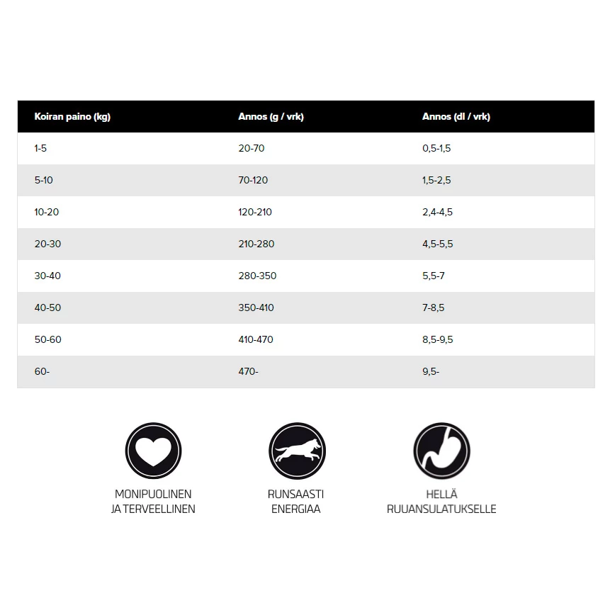 Helposti sulava kotimainen kana sekä muut tarkoin valitut raaka-aineet hellivät vatsaa ja tarjoavat samalla kaikki tarpeelliset vitamiinit, kivennäis- ja hivenaineet joita koirasi tarvitsee. Paljon energiaa sisältävän ruoan kananrasva on hyvin imeytyvää ja sulavaa. Jahti & Vahti Extra Energian amino- ja rasvahappokoostumus on optimoitu vastaamaan aktiivisen koiran tarpeita. Käyttökoira tarvitsee myös runsaasti E-vitamiinia, mikä on reseptissä huomioitu.