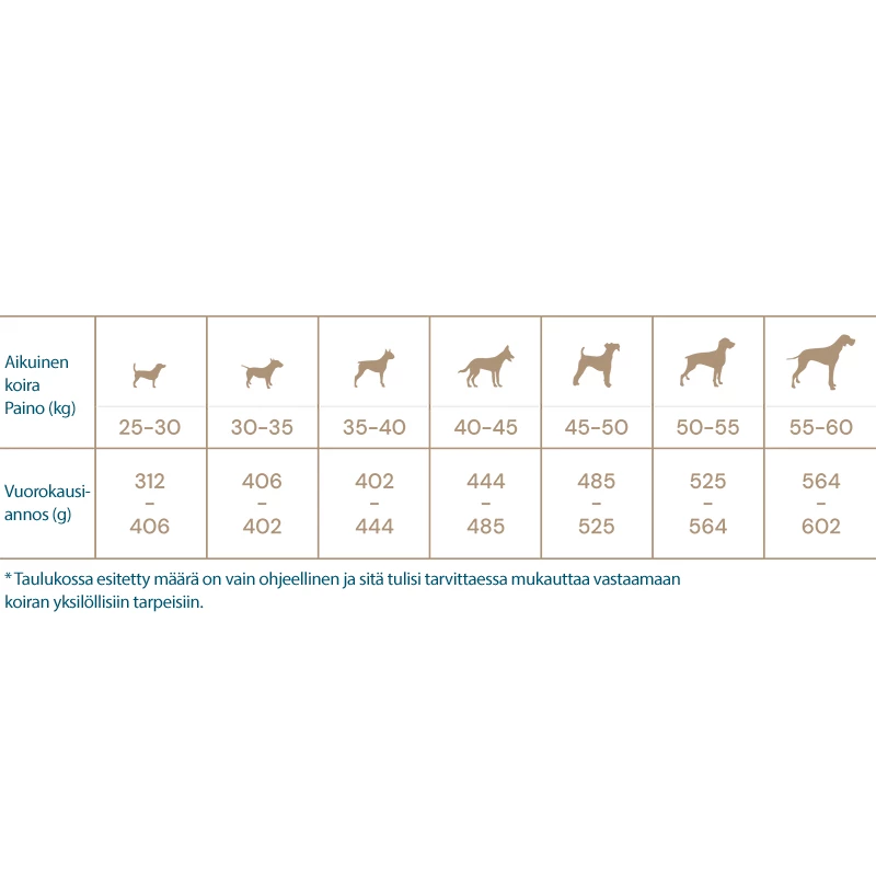 Super Premium -täysravinto, jonka koostumuksessa on huomioitu suuren koon asettamat erityistarpeet. Sisältää 79 % eläinvalkuaista.