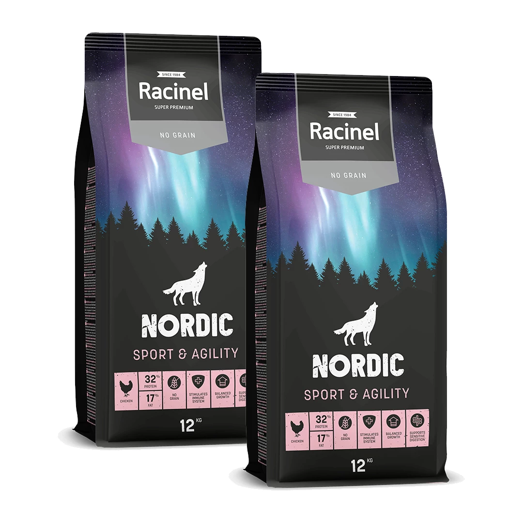 Racinel Nordic Sport & Agility sisältää ravitsevaa, maatilalla kasvaneen kanan lihaa. Laadukas proteiini (proteiinipitoisuus 32 %) auttaa ylläpitämään hyvää lihasmassaa ja se tarjoaa koiralle monia elintärkeitä ravintoaineita. Maistuva kananrasva (rasvapitoisuus 17 %) tarjoaa erinomaisen energianlähteen, josta koira ammentaa voimaa harrastuskentille.
