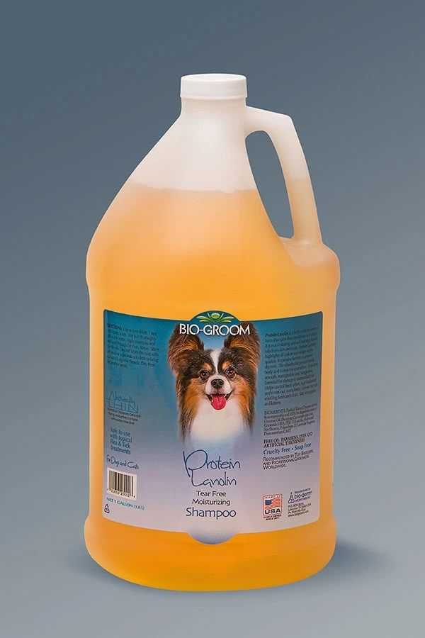 Bio-Groom Protein Lanolin shampoo on erittäin mieto, kookosöljypohjainen shampoo, joka sekä puhdistaa että hoitaa. Ei ärsytä ihoa tai kirvele silmiä. Ei poista turkista tai iholta sen omia luontaisia rasvoja. Korostaa kaikkia värejä ja tekee valkoisesta sädehtivän.