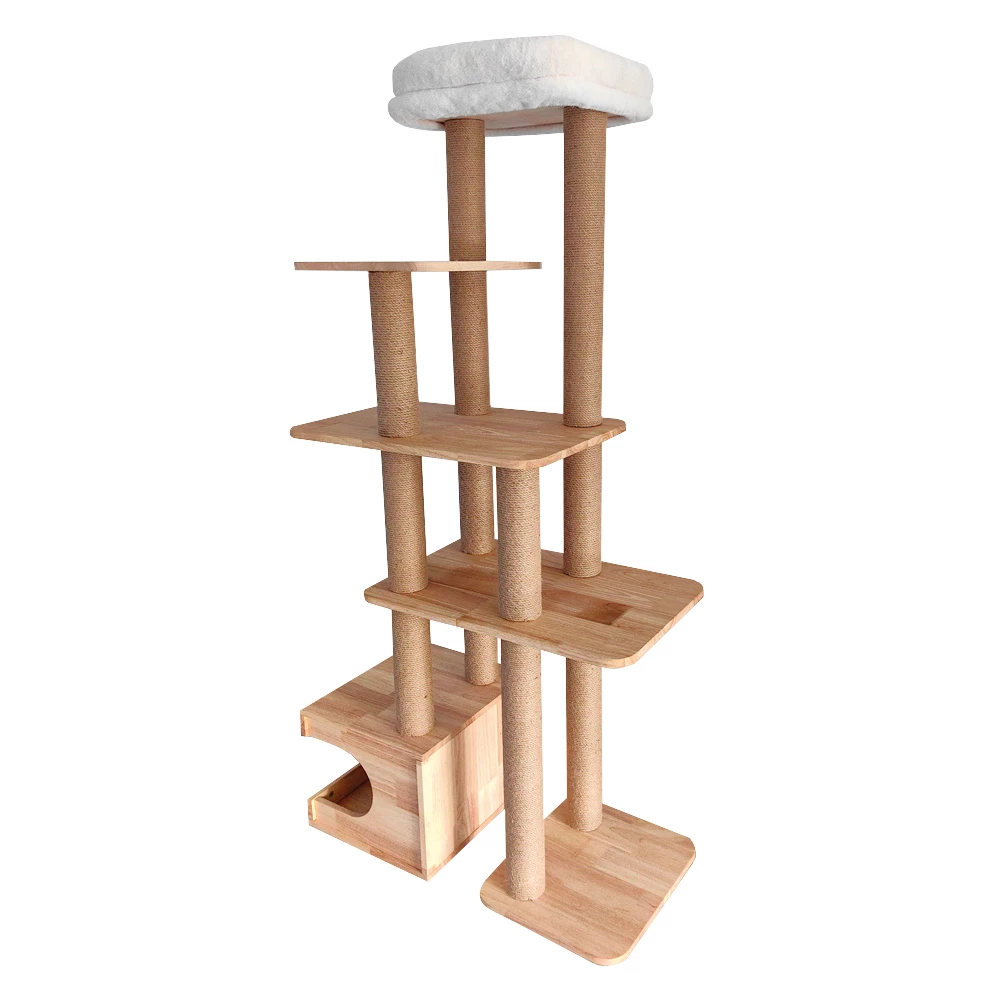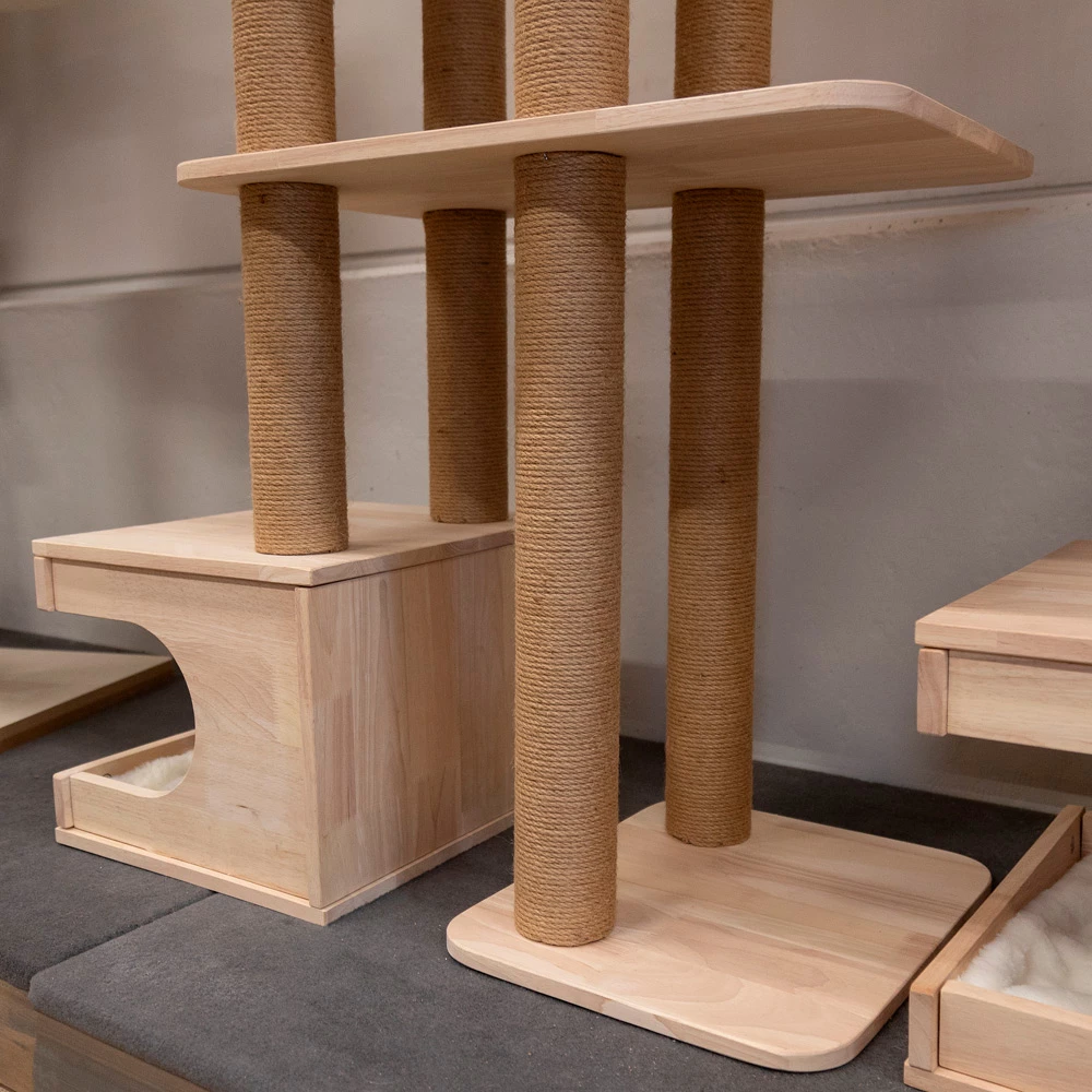Erittäin kaunis, skandinaaviseen tyyliin sopiva kissan kiipeilypuu, jonka puiset tasot, vaaleanruskeat sisal-tolpat ja huipun valkoinen lepo- ja tähystyspaikka luovat harmonisen kokonaisuuden.
