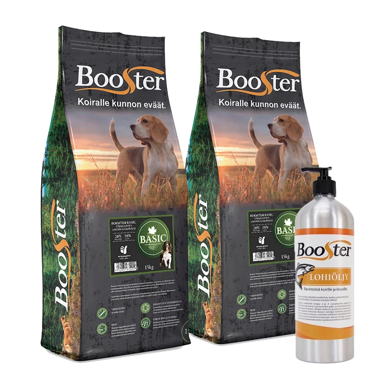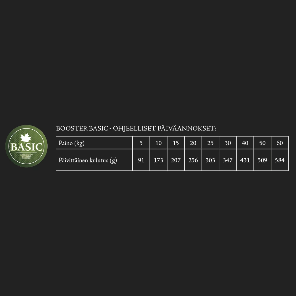 BOOSTER BASIC -koiranruoka sisältää kaikki aikuisen koiran tarvitsemat ravintoaineet hyvään terveyteen ja elinvoimaan.