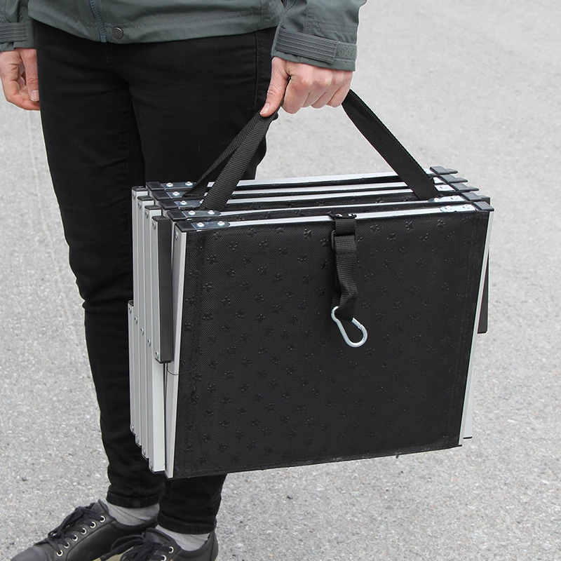 Viisiportainen kokonaisuus taittuu käteväksi salkuksi säilytyksen ja kuljetuksen ajaksi. Salkussa on nailoniset kantokahvat. Kasaan laitettuna portaat mahtuvat hyvin esim. tavaratilaan koiran kanssa. Portaan yläpää kiinnitetään karabiinihaalla auton tavaratilan tasanteen metallilenkkiin. Ylimmän tasanteen pohjassa on pehmuste suojaamassa kosketuspintaa, esim. auton puskuria.