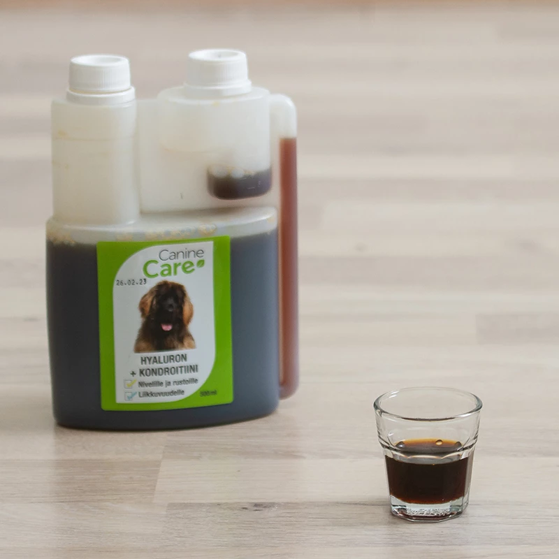 CanineCare Hyaluron + Kondroitiini on helppo annostella mittapullosta. Neste on hyvän makuinen ja se voidaan tarjoilla koiran päivittäisen ravinnon joukossa.