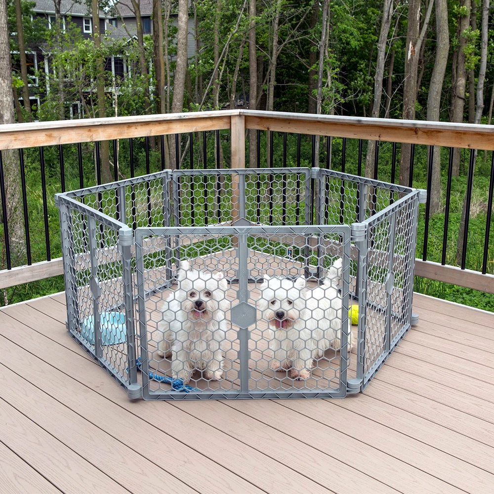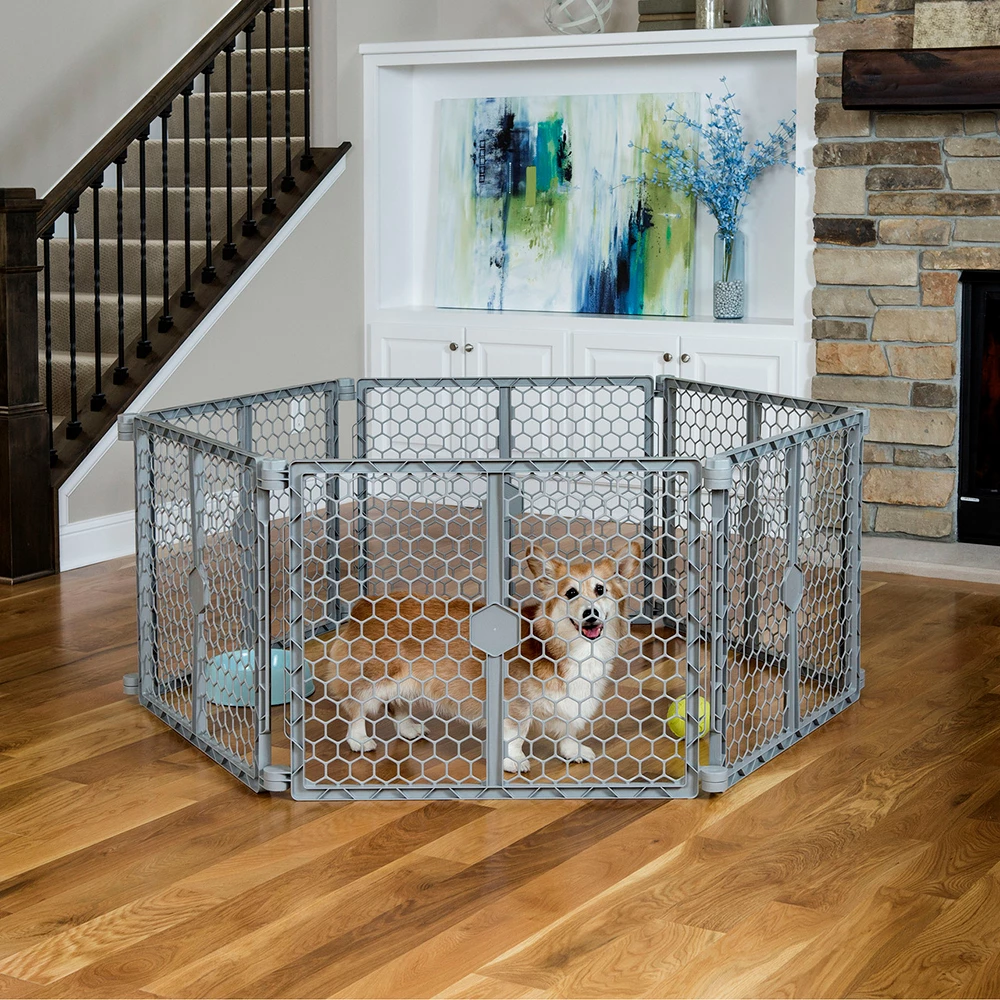 Kevyellä ja helposti pystytettävällä aidalla saa helposti rajattua leveitäkin oviaukkoja ja sen voi nopeasti muuttaa myös pentuaitaukseksi.