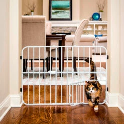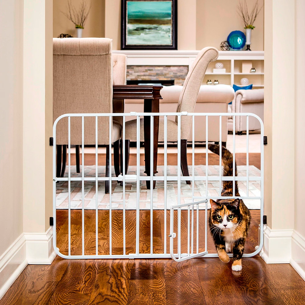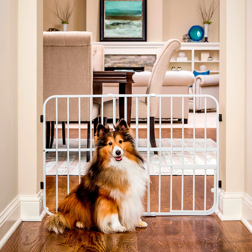 Helposti painekiinnityksellä oviaukkoon pingotettava metallinen aita, joka on nopeasti säädettävissä. Rakenne on luja ja pureskelua kestävä. Aidassa on yksi pieni portti esimerkiksi kissoille ja kaneille.