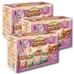 Herkullisen lihaisat viljattomat ja perunattomat märkäruoka-annospussit vaihtelunhaluisille kissoille monipuolisena lajitelmana.