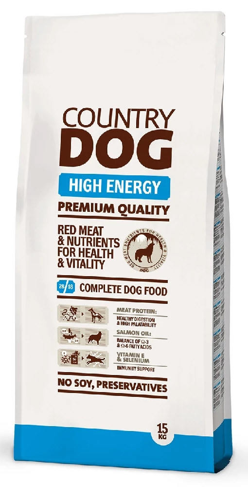 Country Dog Premium High Energy sisältää enemmän rasvaa ja antaa energiaa aktiiviselle, esim. harrastuskäytössä olevalle koiralle. Country Dog Premium High Energy -täysravinnon E-vitamiini, seleeni ja muut vitamiinit ylläpitävät kehon luontaista vastustuskykyä. Lisätty lohiöljyä, jonka sisältämät välttämättömät Omega 3&6 -rasvahapot ylläpitävät mm. ihon terveyttä ja kaunista ja kiiltävää turkkia. Country Dog Premium High Energy on luontaisesti maistuva – se ei sisällä keinotekoisia makuaineita.