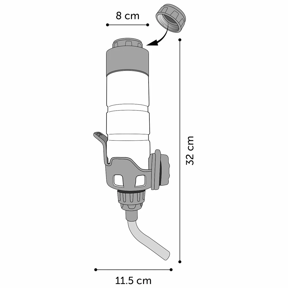 Mitat: Korkeus 32 cm, pullon halkaisija 8 cm, halkaisija pillin kanssa 11,5 cm