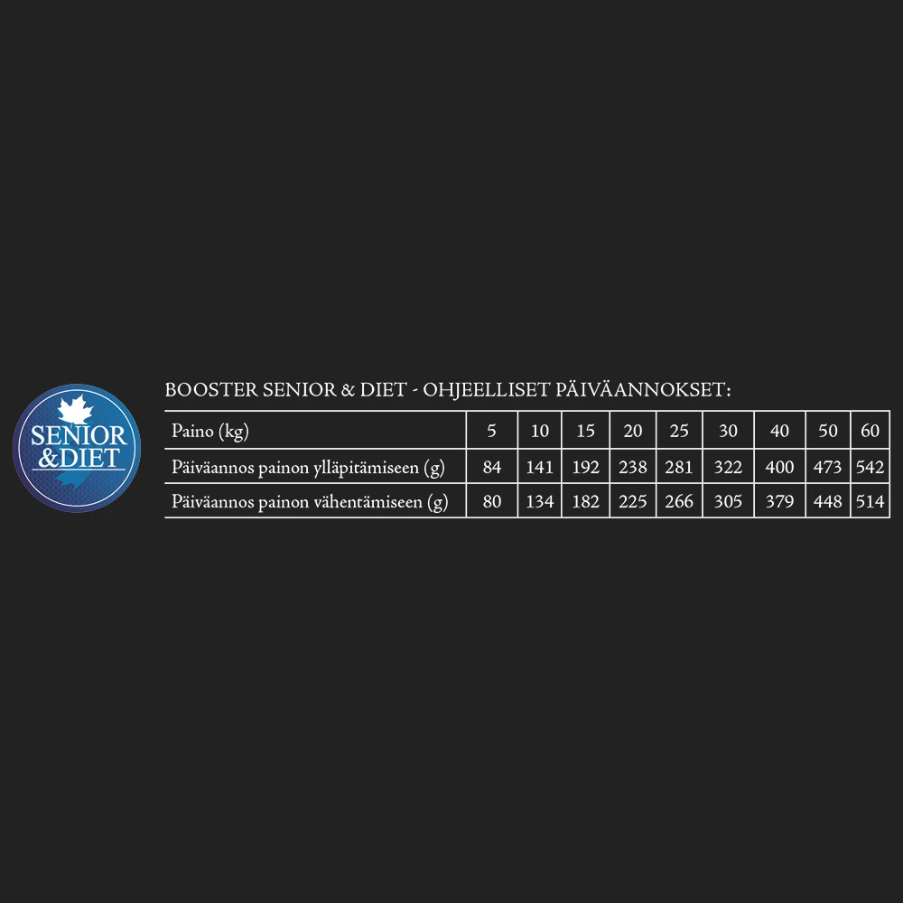 Booster Senior & Diet -täysravinto sisältää kaikki iäkkäämmän tai vähemmän aktiivisen koiran tarvitsemat ravintoaineet hyvään terveyteen ja elinvoimaan. Päävalmistusaineena käytetty korkealaatuista ja hyvin sulavaa kalkkunaa. Hiilihydraatin lähteenä käytetty maissin, riisin ja kuivattujen omenoiden hyvin sulavaa yhdistelmää. Mannan-oligosakkaridit edistävät terveen suolistoflooran kasvua ja tehostavat siten ruuansulatusta ja suoliston toimintaa. Glukosamiini huolehtii nivelten ja rustojen terveydestä. Biotiini ja erityinen yhdistelmä hivenaineita (mm. sinkki) varmistavat terveen ihon ja turkin. Sisältää välttämättömät Omega 3 & 6 –rasvahapot oikeassa suhteessa.