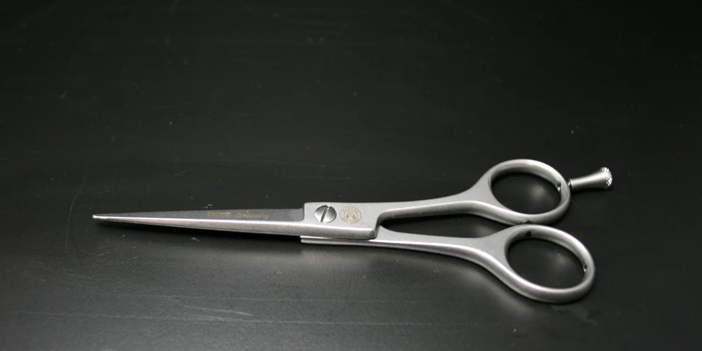 Ruostumattomasta teräksestä valmistetut korkealaatuiset trimmaussakset. Toinen terä on mikrohammastettu. Irrotettava sormituki. Kokonaispituus 14,5 cm. Matta metalli.