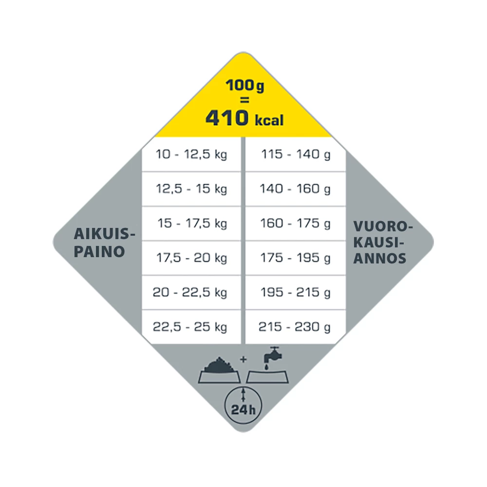 Hyvin sulavat valmistuaineet ilman gluteeniviljoja, ravintokuidut ja prebiootit (FOS, MOS) auttavat tukemaan ruoansulatuskanavan normaalia toimintaa ja varmistamaan pienet, kiinteät jätökset. Kondroitiini luonnollisesta lähteestä (kananliha) yhdessä glukosamiinin kanssa auttaa pitämään nivelet notkeina ja rustot vahvoina. Antioksidantit ylläpitävät vastustuskykyä.