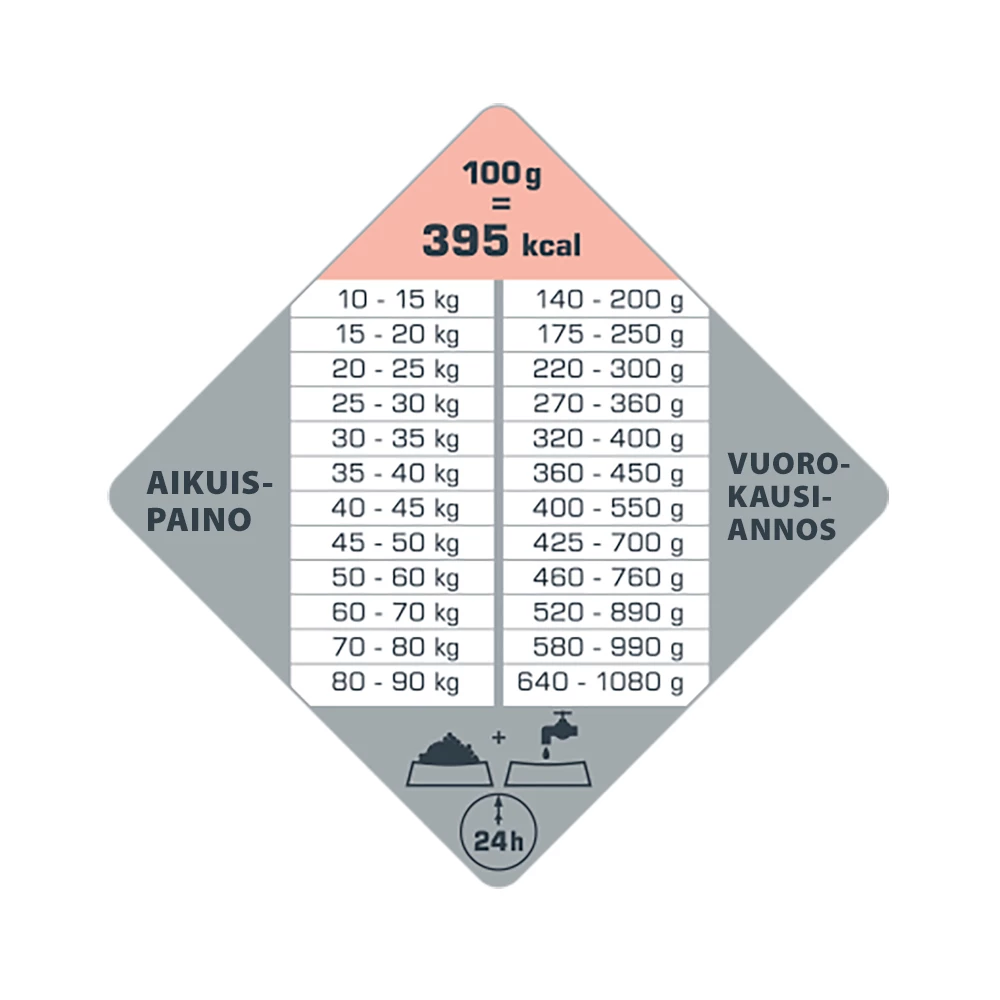 Lisätty gluskosamiinia nivelten toiminnan tueksi. Ravintokuidut ja prebiootit (MOS, FOS) yhdessä helposti sulavien valmistusaineiden kanssa auttavat varmistamaan optimaalisen ruoansulatuksen ja pienet, kiinteät jätökset.
