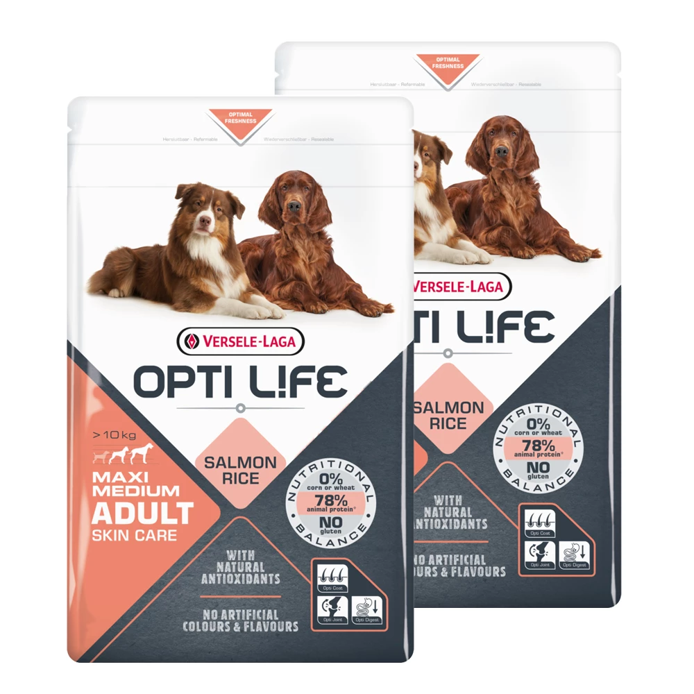 Opti Life Adult Skin Care Medium & Maxi (lohi-riisi) on keskikokoisten ja suurien, yli 10 kg painoisten koirien täysravinto, joka tukee ihon ja turkin hyvinvointia. Tuotteen sisältämästä proteiinista 78% on eläinperäistä. Maistuva lohi on monen vaateliaatkin makutottumukset omaavien koirien mieleen. Gluteeniton koostumus yhdessä lohen kanssa on helposti sulava ja sopii myös monille herkkävatsaisille tai ruoka-aineyliherkkyyksistä tai -allergioista kärsiville koirille.