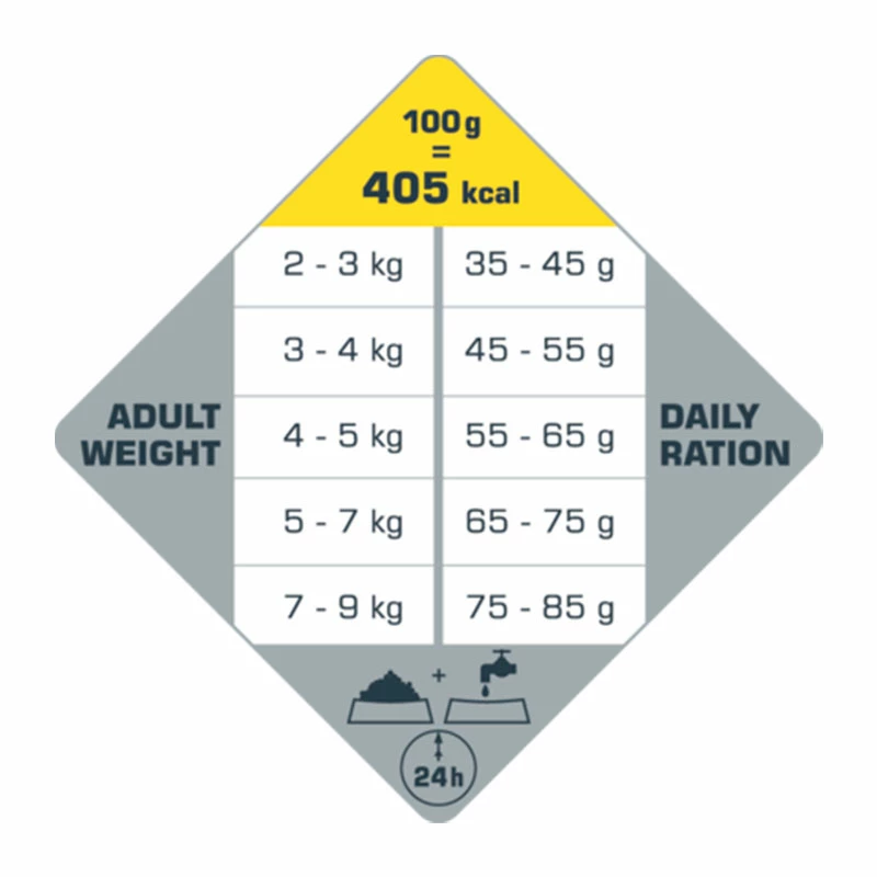 Koostumus: Kana (kuivattu 45%), peruna, herneet, eläinperäinen rasva, kasviperäiset kuidut (selluloosa 5,5%, punajuurimassa 2,5%), hydrolysoidut eläinvalkuaiset, panimohiiva, lohi, lohiöljy, kuivatut kokonaiset munat, FOS (0,3%), mineraalit, MOS (0,1%), glukosamiini 500 mg/kg, yucca (250 mg/kg), rosmariini (14 mg/kg), vihreä tee (10 mg/kg)