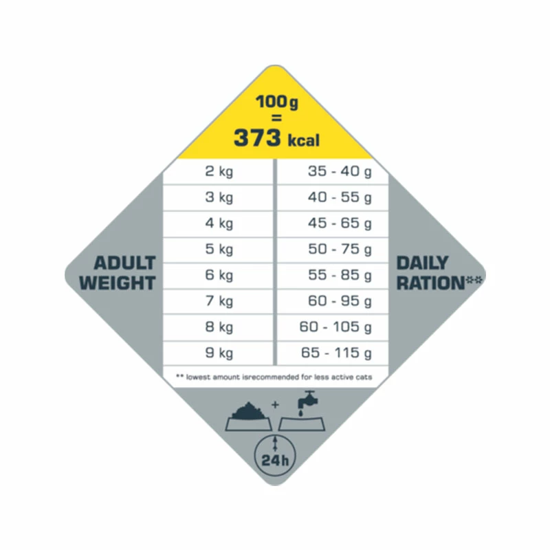 Täysravinto steriloiduille tai muuten ylipainoon taipuvaisille aikuisille kissoille sisältää paljon niiden tarvitsemaa proteiinia ja vain vähän hiilihydraatteja, mikä auttaa kissaasi pysymään ihannepainossaan ilman näläntunnetta.