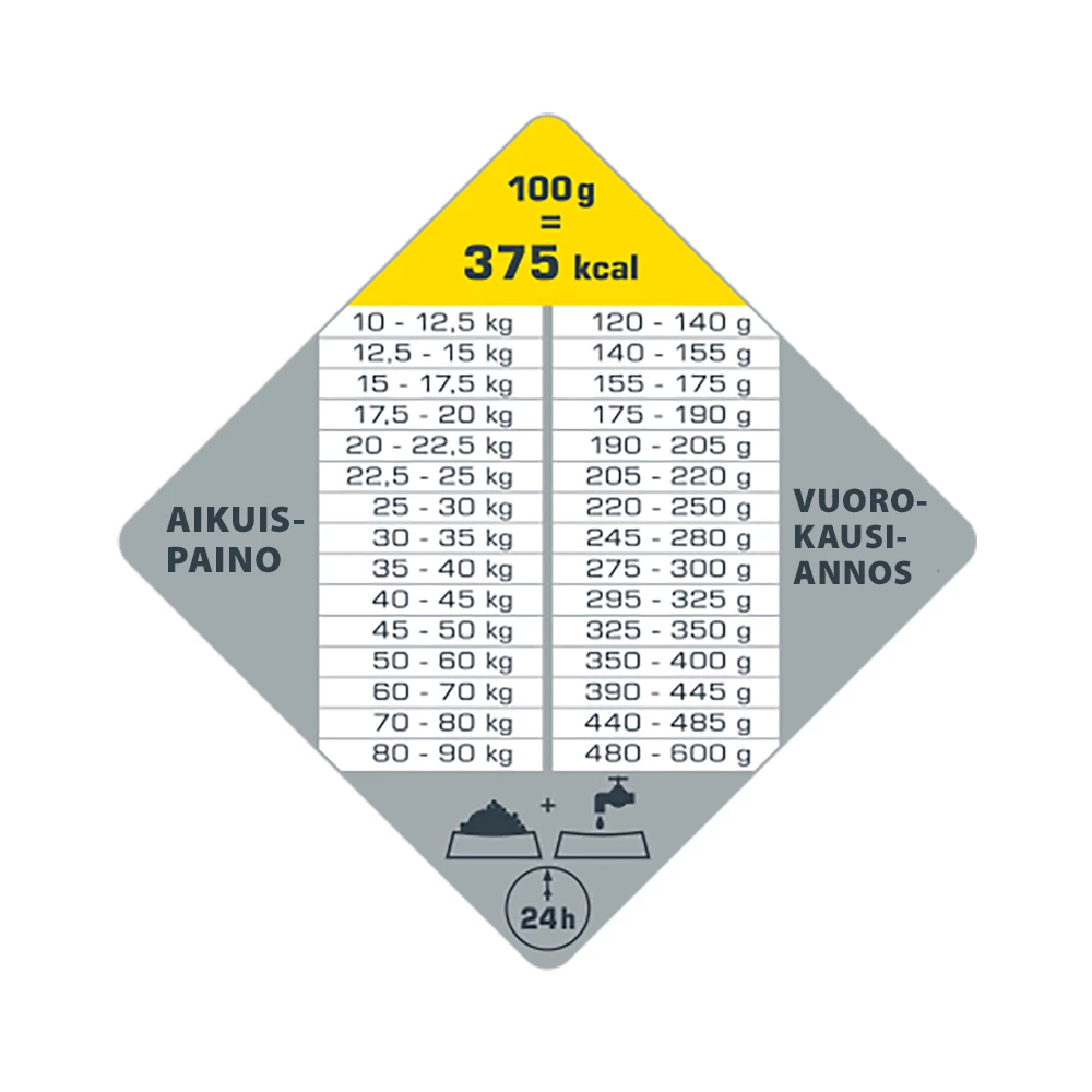 kana (kuivattu 28%), riisi (27%), riisijauho, kasvikuidut (selluloosa 5,5%, juurikasmassa 1%), eläinrasva, pellavansiemenet, lohiöljy, panimohiiva, kivennäiset, kuivattu kananmuna, FOS (0,1%), MOS (0,1%), lesitiini, merilevä (Ascophyllum nodosum), glukosamiini 500 mg/kg, kurkuma, rosmariini (14 mg/kg), samettikukka, vihreä tee (10 mg/kg).