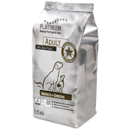 Platinum Adult Iberico + Greens on hellävaraisesti painekypsennetty omassa liemessään 95°C lämpötilassa. Painekypsentämisen jälkeen ruoka kuivataan hitaasti ja vasta valmistuksen loppuvaiheessa siihen lisätään kylmäpuristetut öljyt, yrtit ja vitamiinit. Lopuksi tuote pakataan ilmatiiviiseen pakkaukseen, jotta puolikostea koostumus säilyy herkullisena ja maku ja tuoksu optimaalisena.
