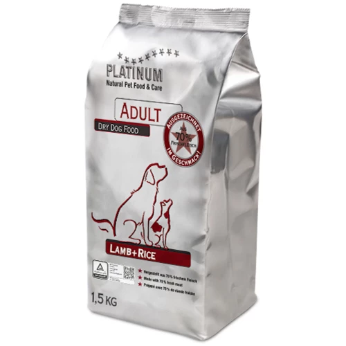 Platinum Adult Lammas + Riisi on valmistettu hellävaraisesti painekypsentämällä omassa liemessään. Painekypsentämisen jälkeen ruoka kuivataan hitaasti ja valmistuksen loppuvaiheessa siihen lisätään kylmäpuristetut öljyt, yrtit ja vitamiinit. Lopuksi tuote pakataan ilmatiiviiseen pakkaukseen, jotta puolikostea koostumus säilyy herkullisena.