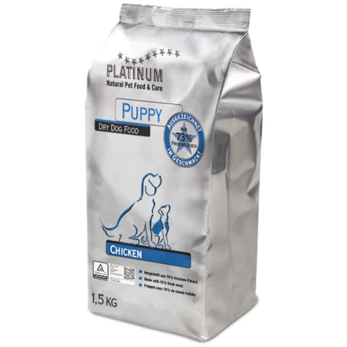 Platinum Puppy Kana on valmistettu hellävaraisesti painekypsentämällä omassa liemessään. Painekypsentämisen jälkeen ruoka kuivataan hitaasti ja valmistuksen loppuvaiheessa lisätään kylmäpuristetut öljyt, yrtit ja vitamiinit. Lopuksi tuote pakataan ilmatiiviiseen pakkaukseen, jotta puolikostea koostumus säilyy herkullisena.