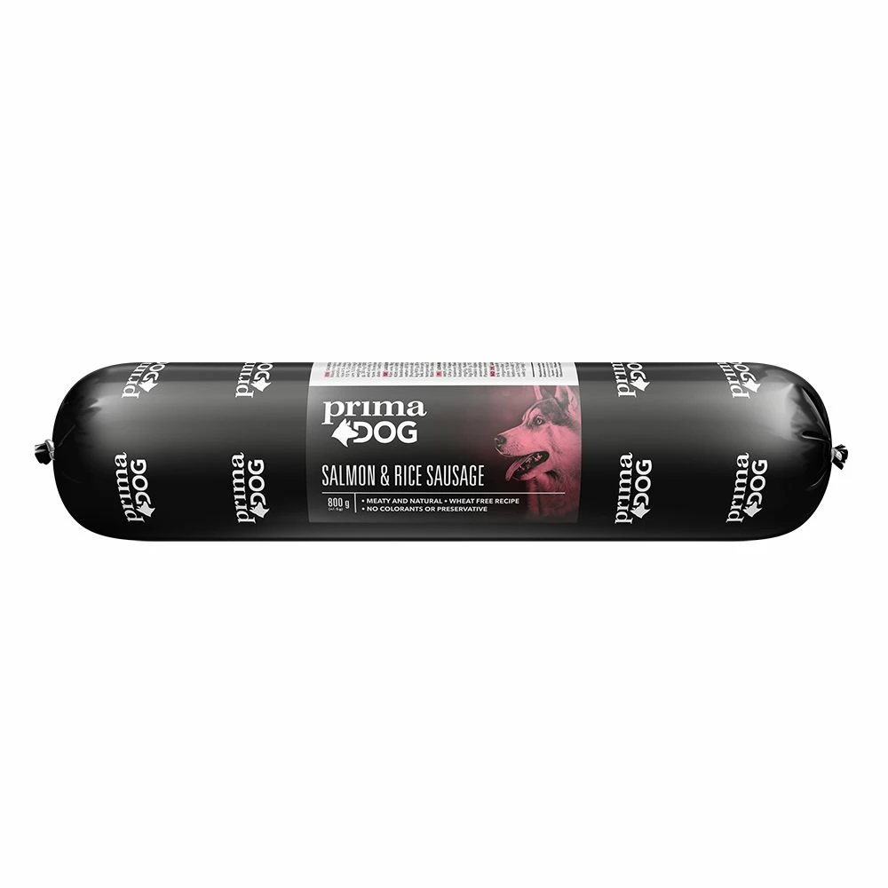 Maistuvan lihaisa PrimaDog Salmon & Rice Lohi-riisi -makkara soveltuu tarjoiltavaksi koiralle pääasiallisena ravintona tai lisukkeeksi kuivaruuan oheen. Koostumukseltaan kiinteä makkara on helppo pilkkoa ja käyttää vaikka makupalana koulutuksessa.
