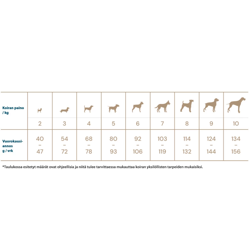 Katso viitteellinen annostusohje tuotteen kuvista. Taulukossa esitetyt määrät ovat ohjeellisia ja niitä tulee mukauttaa koiran yksilöllisten tarpeiden mukaisesti.