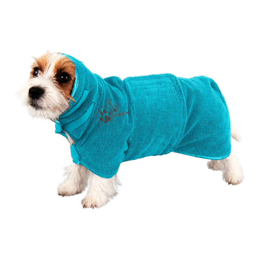 Korkealaatuinen mikrokuitukylpytakki imee kosteuden tehokkaasti itseensä. Likainen ja/tai märkä lemmikki on helppo kääräistä paksuun mikrokuitukylpytakkiin. Kylpytakki suojaa huonekaluja tehokkaasti koiran ravistelulta, vaikka lemmikki olisi ainoastaan pyyhekuiva. Kylpymantteli imee tehokkaasti vettä itseensä märän koiran turkista ja auttaa lyhentämään koiran kuivaamiseen kuluvaa aikaa. Tarranauhalla säädettävä vyö sekä korkea kaulus pitävät kylpytakin hyvin paikallaan vaikka lemmikki kulkisi asunnossa vapaasti. Soveltuu hyvin käytettäväksi myös esimerkiksi automatkoilla.