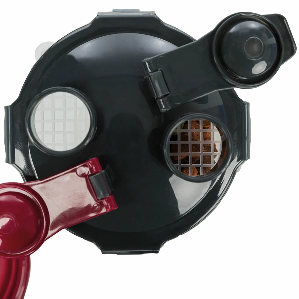 Säiliön kyljessä on hakakiinnike, johon litteäksi taittuva silikonikuppi voidaan kiinnittää. Kupissa on tukevuutta tuova muovinen reunus. Pullon kyljessä merkinnät 5 ml välein.